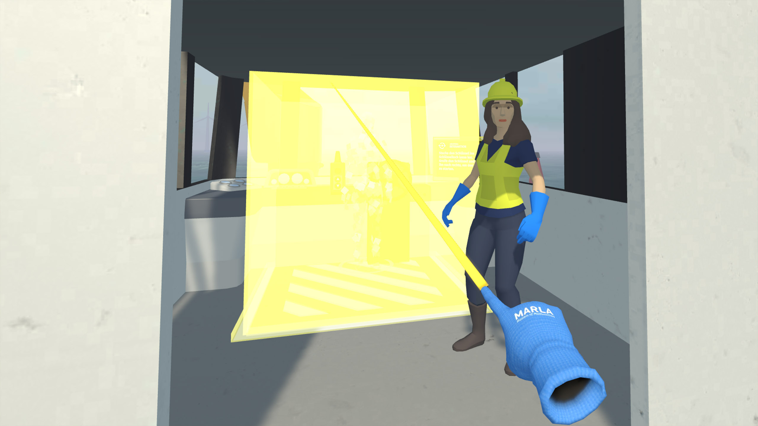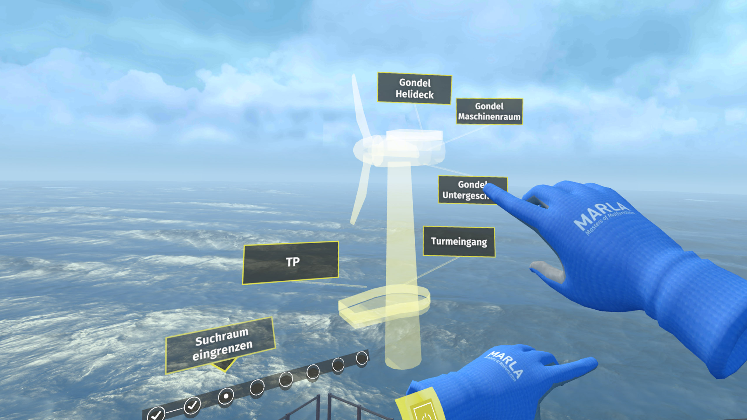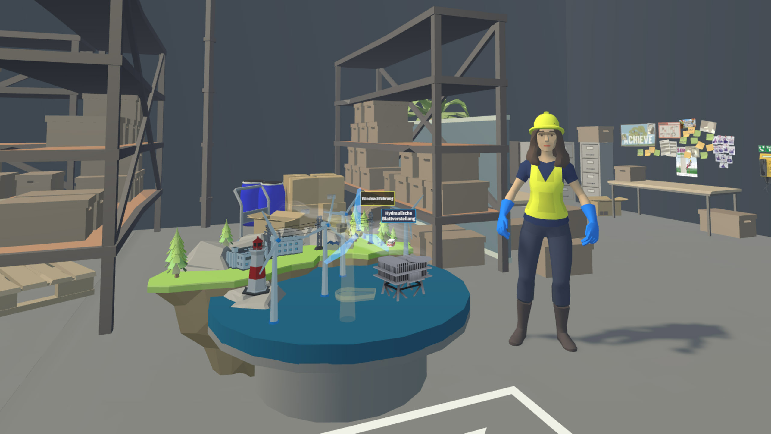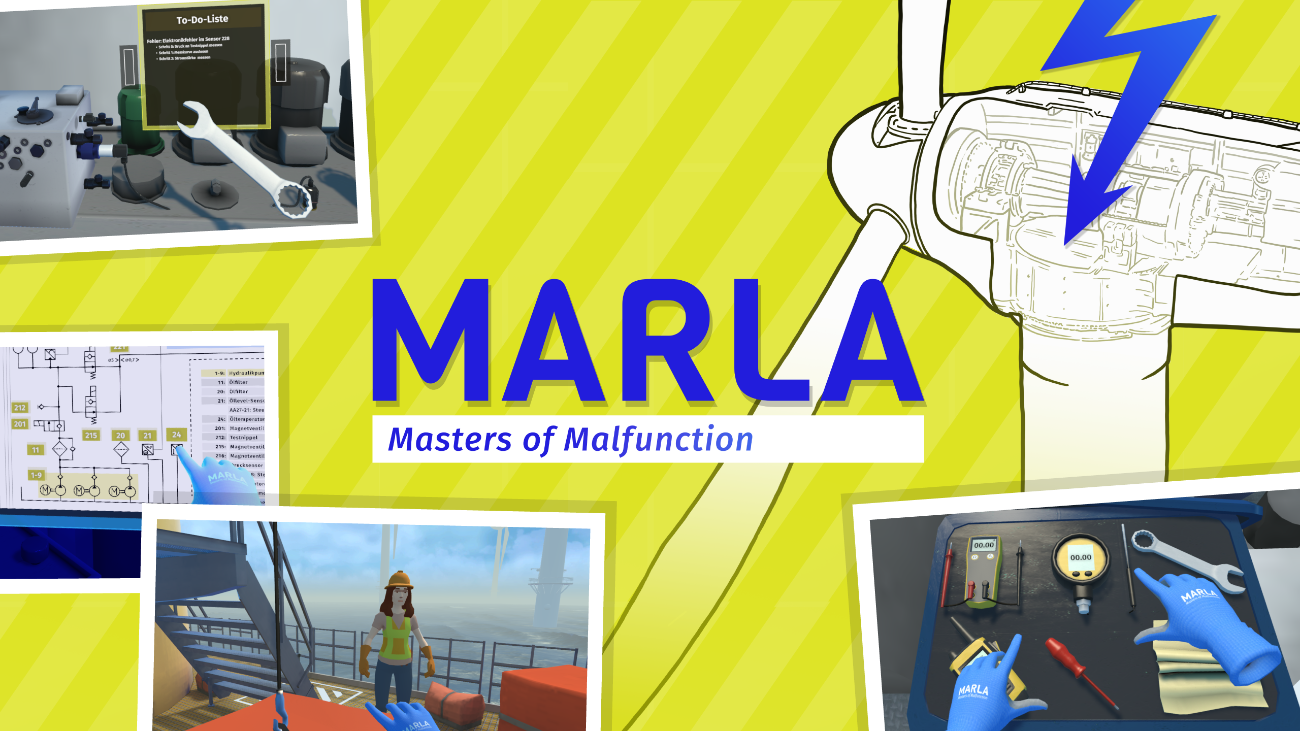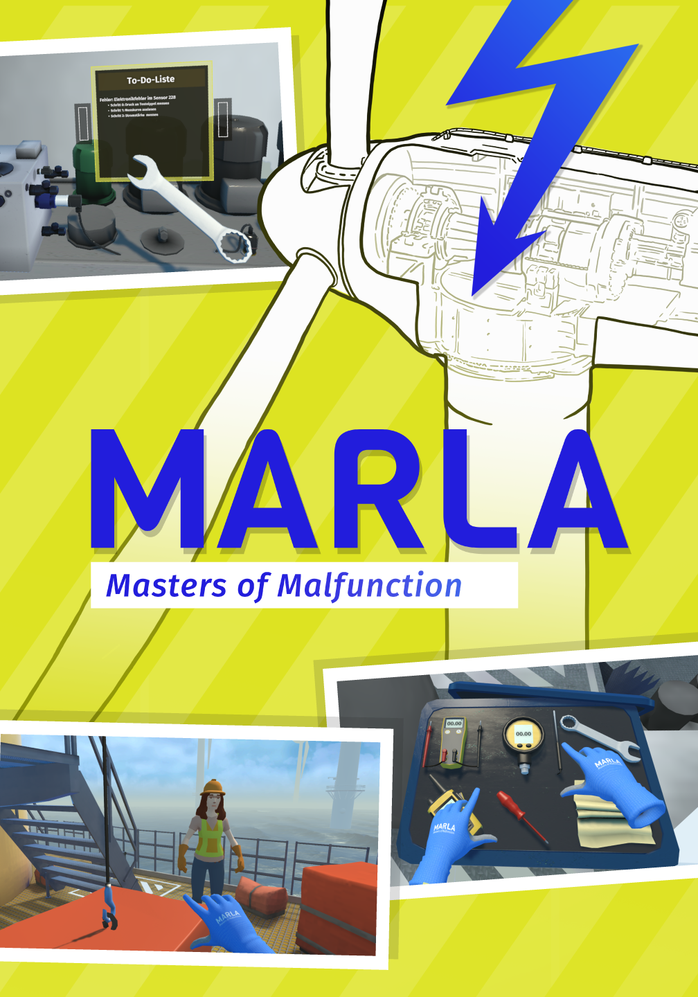 "Grab your safety helmet, put on your harness and head out to sea. 35km off the coast of Rügen lies the offshore wind energy farm where you can put your skills in fault diagnosis and maintenance to the test. Armed with a multimeter, screwdriver and cleaning rag, you will accompany Alex to a wind energy plant. Together you master the eight steps of fault diagnosis. After the successful mission, you are suddenly on your own. Now you can prove yourself as a "Master of Malfunction" and fix the next fault professionally." In the virtual reality game MARLA, players step into the role of a service specialist for wind energy who has to fix a fault on an offshore turbine. Before they take a boat to the wind farm, virtual mini-models are used to explain the turbine functions. Once at the wind turbine, they learn that a fault has occurred in the turbine's hydraulic braking system, which they must find and fix so that the turbine can be put back into operation. In the machine room high up in the nacelle, they check possible causes of the fault. During this process, the virtual specialist "Alex" is always at their side as an "educational agent". She explains the tasks to the players and provides assistance if they encounter difficulties. In addition to the pedagogical agent, the players have access to a virtual help view, which they can use to identify components and their functions. After the successful troubleshooting with support from "Alex", the players can immerse themselves once again in the everyday working life at the offshore plant in a second game run without support, this time to gain further experience in troubleshooting on their own.