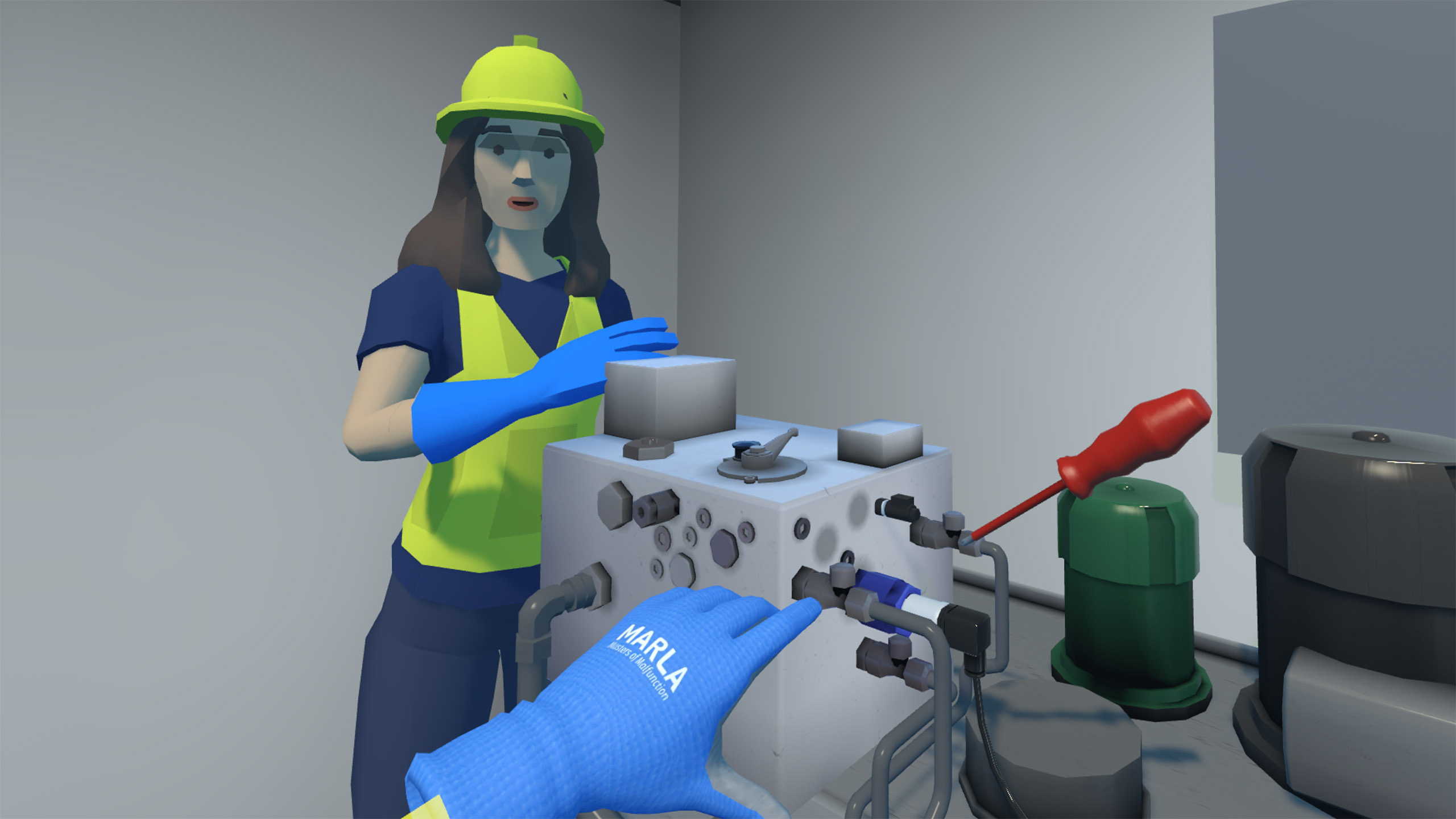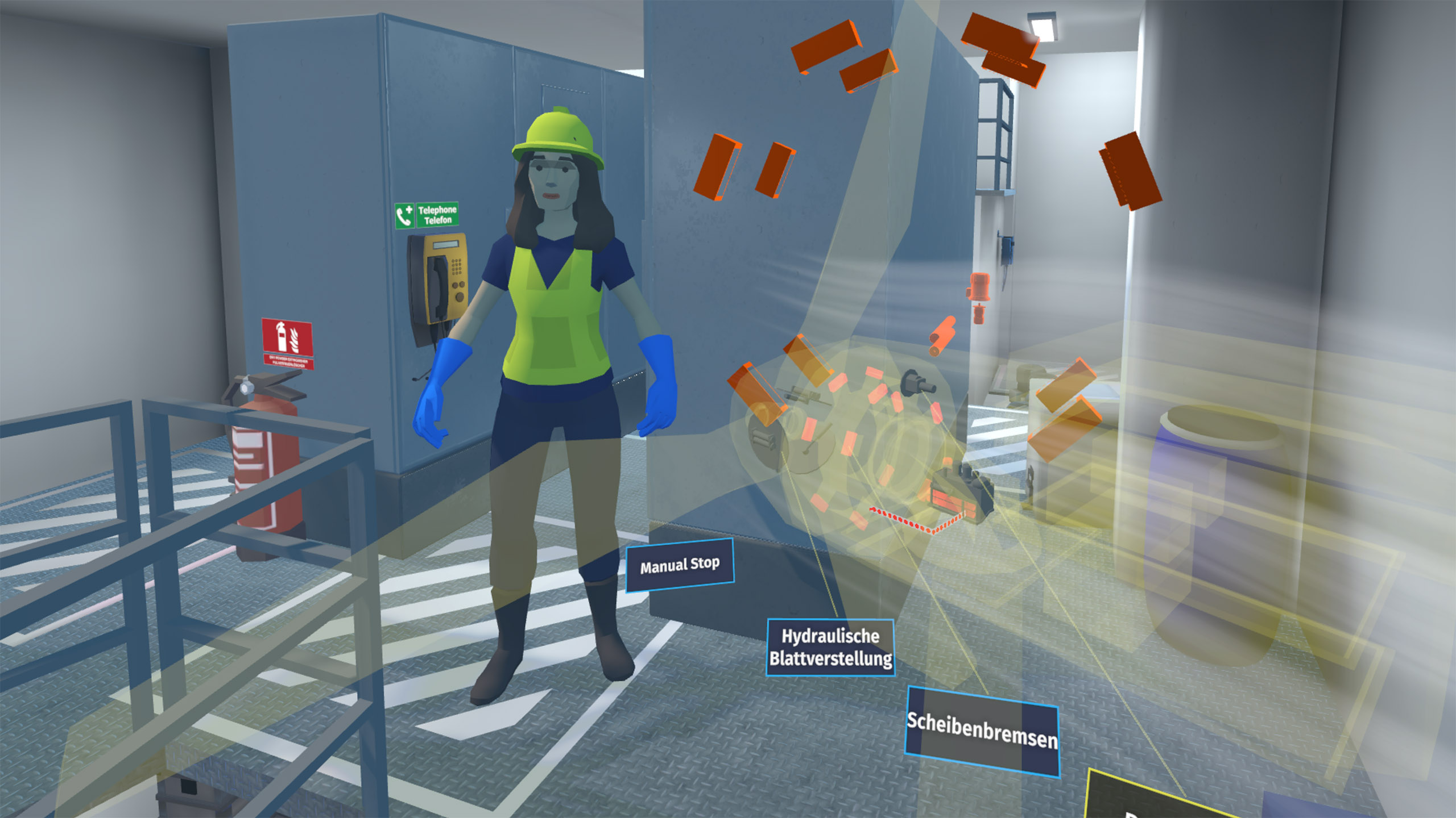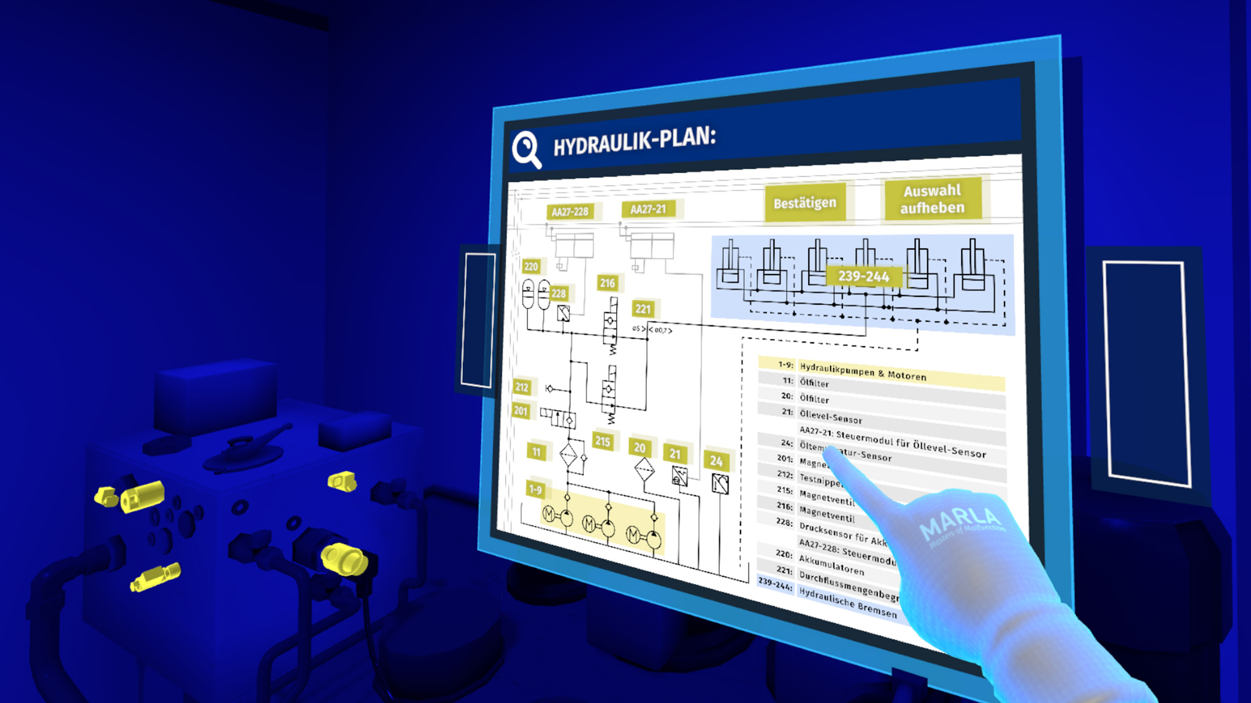 THE IDEA - In studies on fault diagnosis competence, it is observed that young skilled workers* are not sufficiently proficient in a structured approach to fault diagnosis. They lack experience. The problem is also perceived by teachers in vocational schools. They would like to see didactic material with authentic application scenarios on complete plants for teaching purposes, so that they can better train fault diagnosis skills during their training. The aim of MARLA is to trace the cause of various complex faults in the hydraulic braking system of an offshore wind turbine. A systematic and logical approach is required. With the help of VR technology, they immerse themselves in a virtual experience and test their knowledge directly on an offshore turbine. All this happens completely safely for people and equipment. The players try out their skills in a protected, virtual space. Danger to life and limb or possible damage to the wind turbine by errors of the trainees can be excluded.